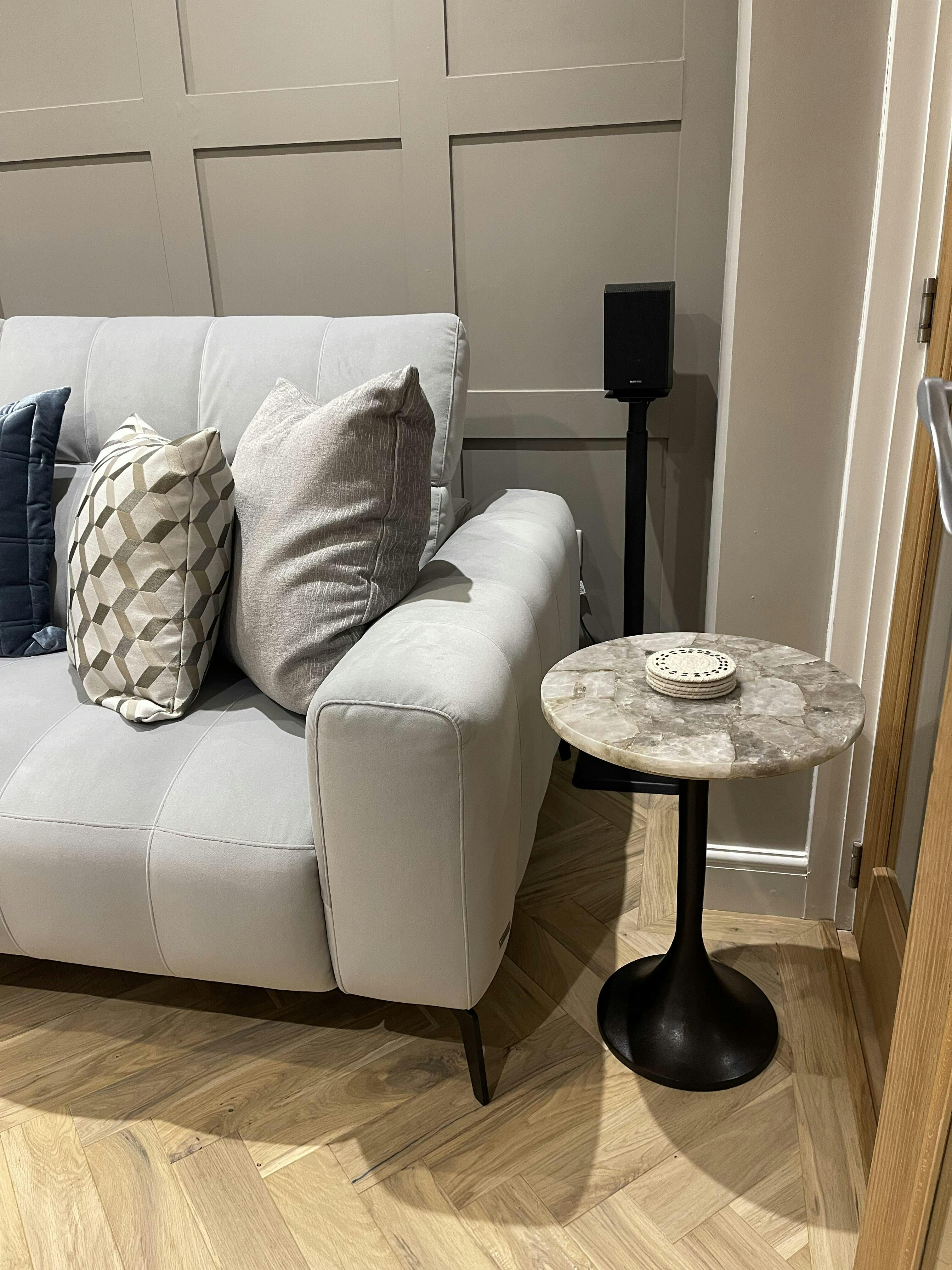 The Bosworth Smokey Quartz Round Side Table showcases a stunning fusion of Smokey grey quartz, creating a unique and sophisticated finish. The quartz rests on a round aluminium base finished in antique brass. Although the proportions are small, the effect is stunning. This elegant piece effortlessly blends luxury and modernity, making it a perfectly versatile addition to any space. The Bosworth collection is available in side tables in 42 cm and 60 cm sizes, as well as an 80cm coffee table.